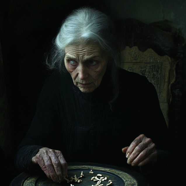 Great-Granny Gertrude prefaced her prognostications with a ratlike clickin’ of the tongue before falling into a gibberin’ converse with unseen things you could almost feel pressin’ up against you in the room. She’d roll those knucklebones like a crap shooter; and they’d land in a painted tray she’d brought over from Hesse-Cassel when she crossed the Atlantic sometime around 1868.