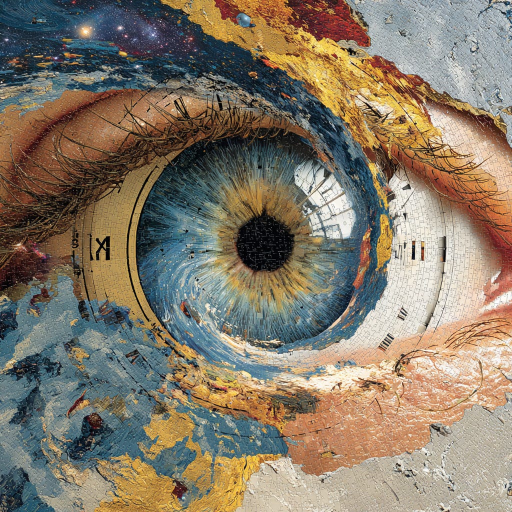 Imagine if your eyes and occipital lobe functioned in isolation of the other faculties of the mind. Would such a limited brain, a vegetative one, be capable of comprehending time in the same way we do with our intact cerebral cortex? Or would the eyes absorb light while leaving it up to the occipital lobe to register the position of objects and their relationships with one another as static snapshots or two-dimensional transparencies, which, when overlaid, create a sort of atemporal stereographic map?