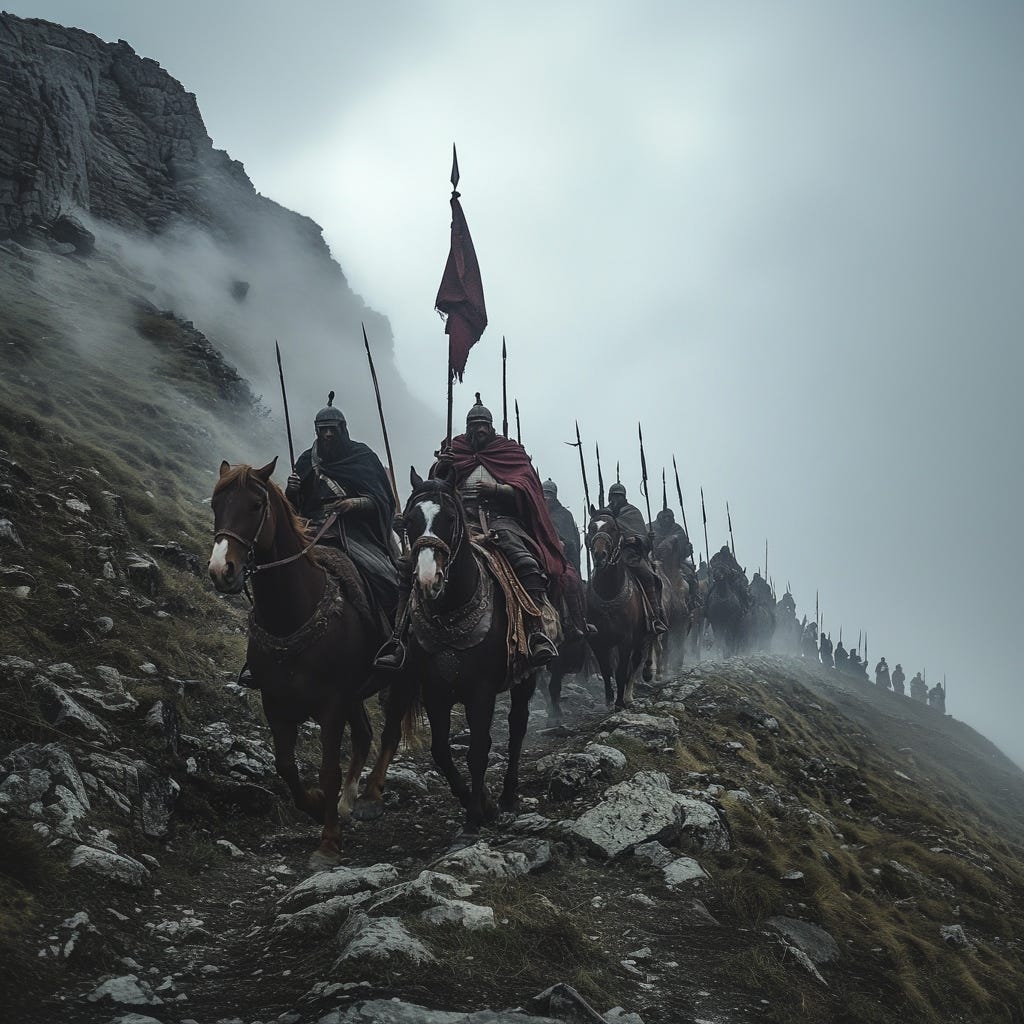 Suddenly, the vulture made a croaking sound. The thief dropped his meal and sprang behind a rocky projection. He peeped around the corner. A large army on horseback was coming up the same path Marcian had been descending, bearing the standard of the King of Sasan. Either the battle’s been called off or something has happened—perhaps a truce.