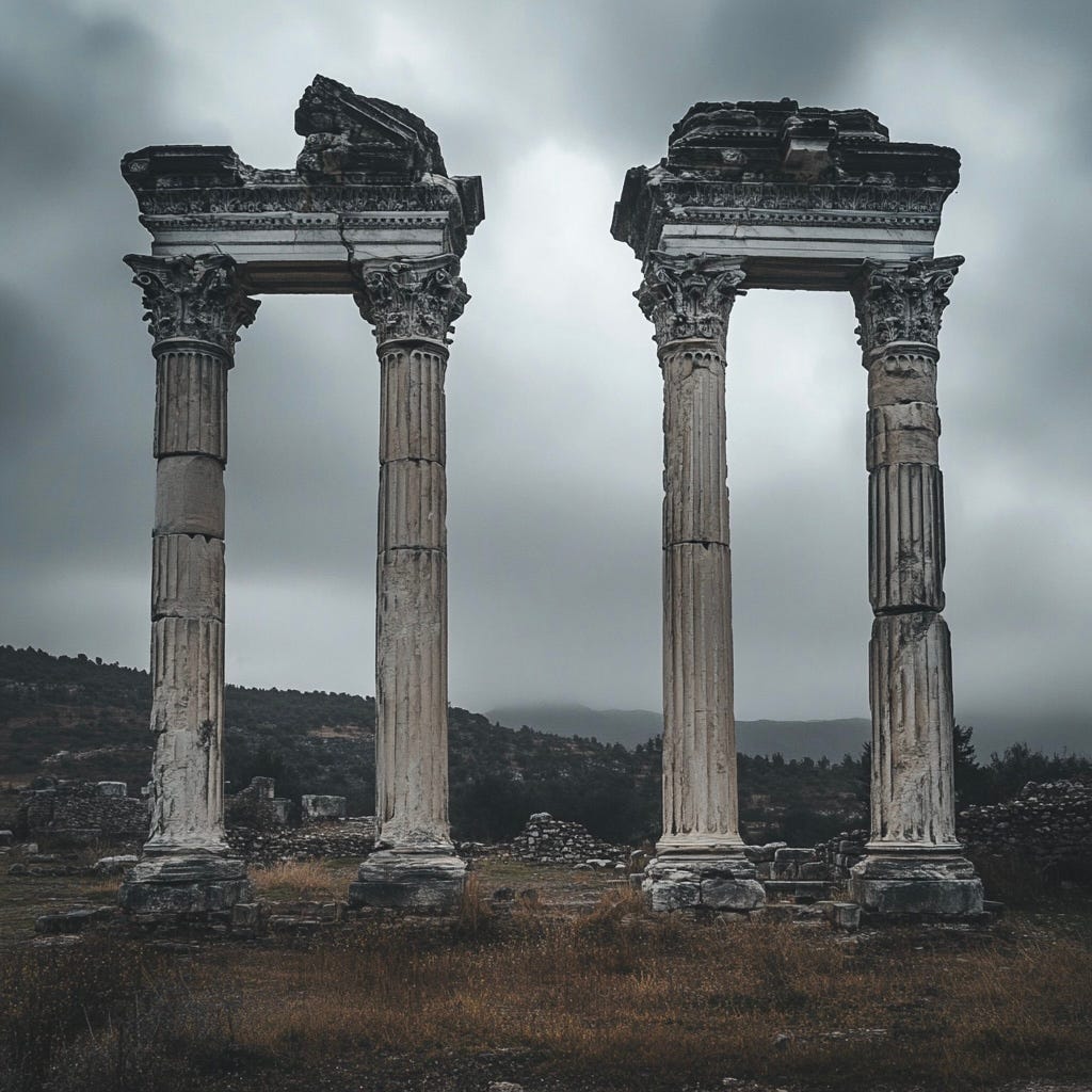 In a panic, Marcian dashed to a line of four lofty pillars whose capitals were carved like acanthus leaves. They were grouped in two pairs, each supporting a crumbling entablature that had served as the portico of some pompous edifice. The fluted drums of the pillars wobbled in the wind but had been engineered to do so, being capable of withstanding the tremors of a mild earthquake.