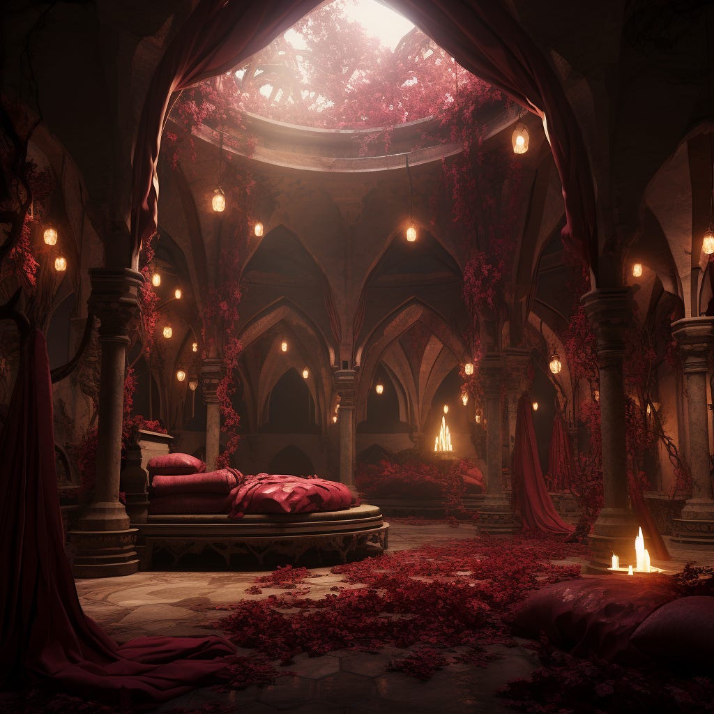 Sunlight filtered into the cave from a hazy remoteness. She approached it and rounded a corner, finding herself inside a perfumed room with a bed covered in silks and bolsters. A jinniyah (a girl jinn) was preparing an array of sherbets for Bilqis to enjoy after her day of subterranean exploration.