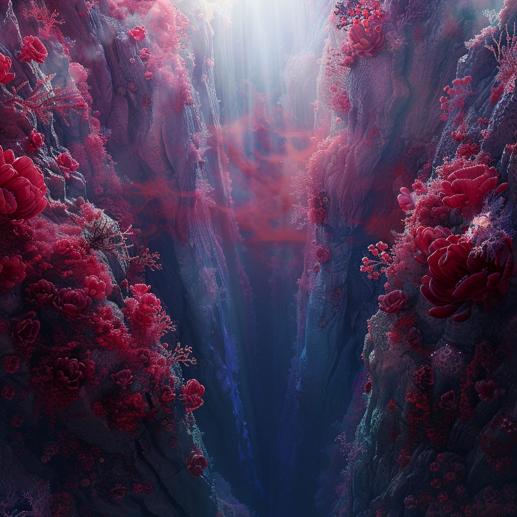 She saw an archway, the edges of which were carved with arabesques, and passed through it. Looking down, she gasped in amazement. It was as though she trod on the surface of the sea. Beneath her, vast canyons plunged to unfathomable depths. The walls of this submarine world were ribbed with flaming coral. Rubies glittered and flashed from the many veins and crevices that cut through the gorgeous steeps. The sea lacked only waving fauna and fishes to give it life.